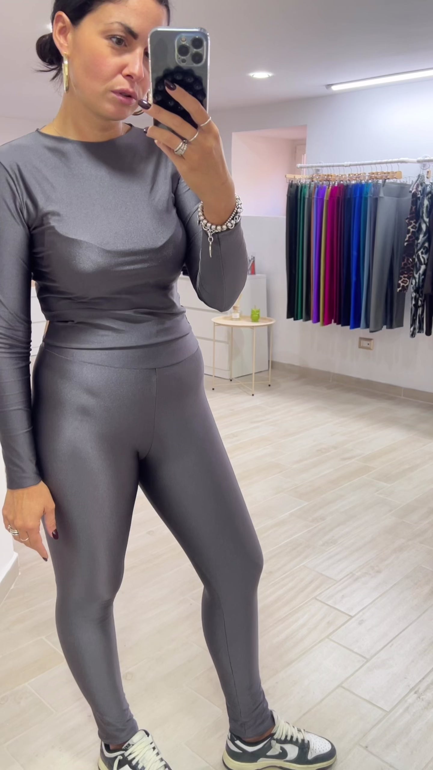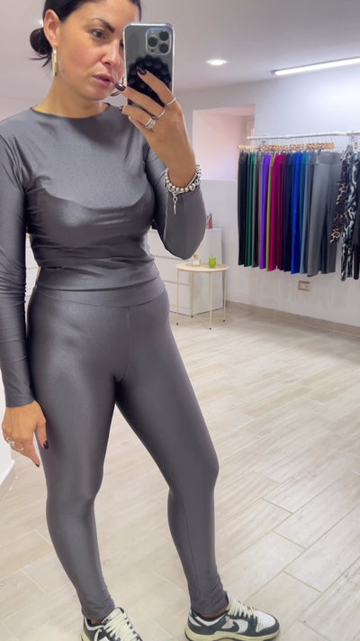 Doppio tessuto performante: esterno in lycra Sumatra lucida, interno in Vita Suede rigenerato ECONYL®. Fascione alto in vita con elastico modellante. Leggings traspirante, ultra coprente e confortevole. Ideale per training o look urban.